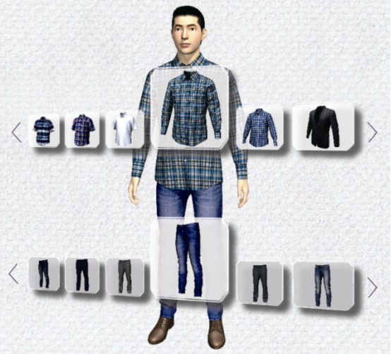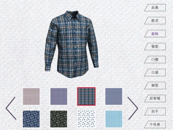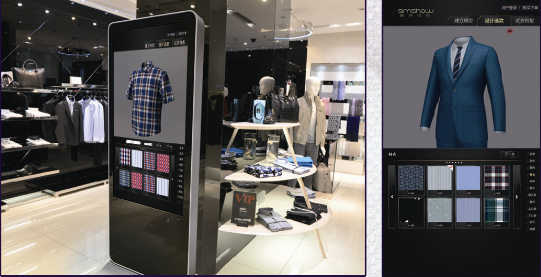 2、海量虚拟样衣,节约成本。顾客在试衣机上选择扣位,面料,衩位,口袋等,成衣效果立即出现,选择变得直观,高效,无风险。